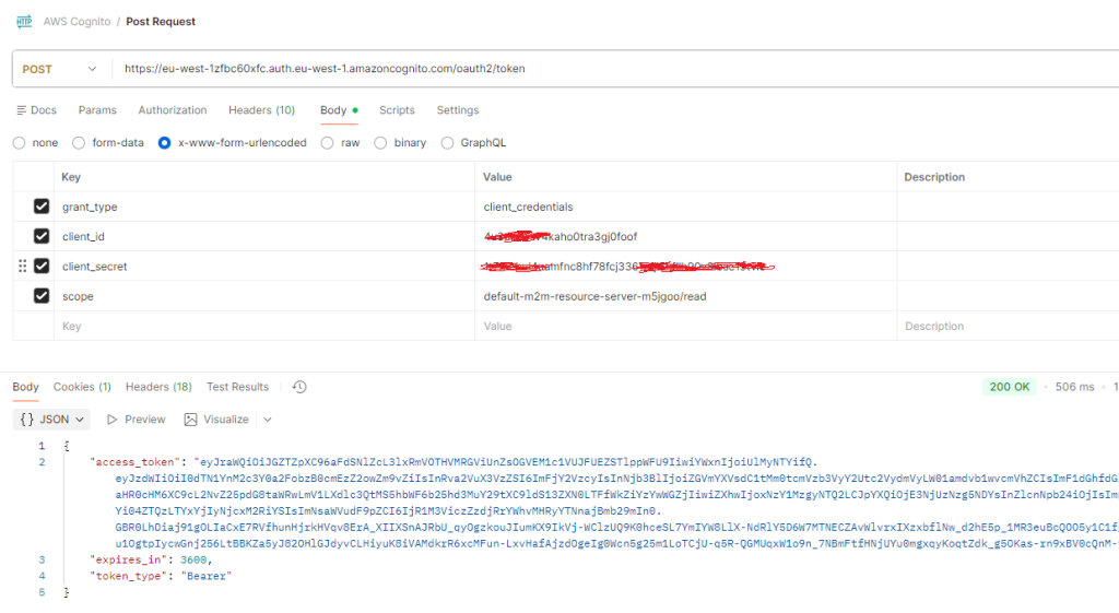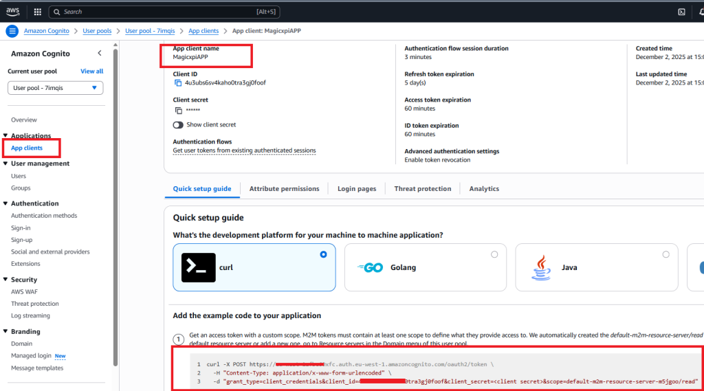 Return to App client level, scroll down and copy the information to get an access token from aws Cognito