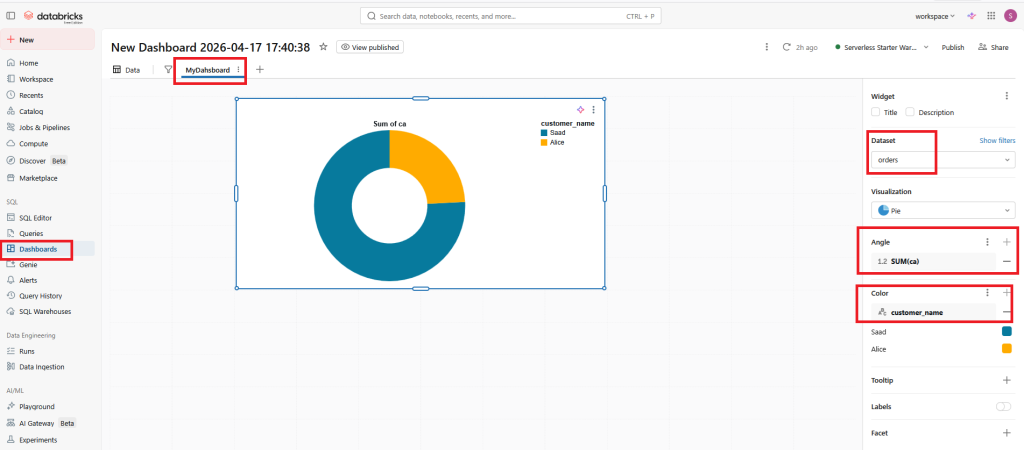 To display a Pie, choose SUM in the Angle and customer_name in the Color properties.