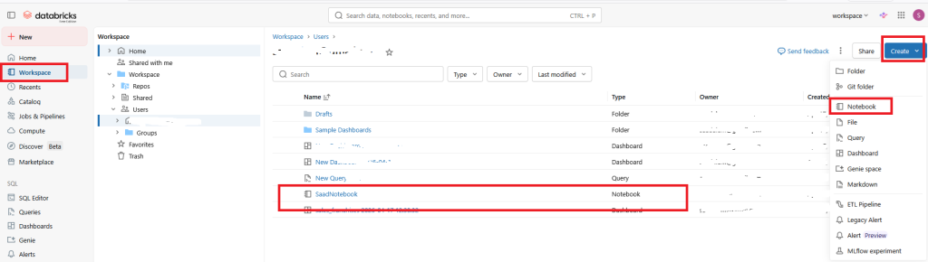 3/ create a notebook in your workspace
