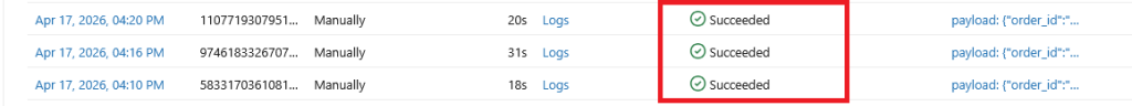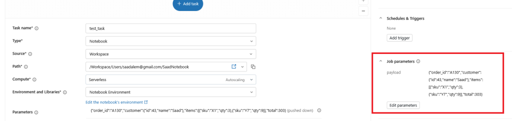 Go to Job parameters, set the key to : payload and the value to {« order_id »: »A130″, »customer »:{« id »:43, »name »: »Saad »}, »items »:[{« sku »: »X1″, »qty »:3},{« sku »: »Y7″, »qty »:9}], »total »:303}