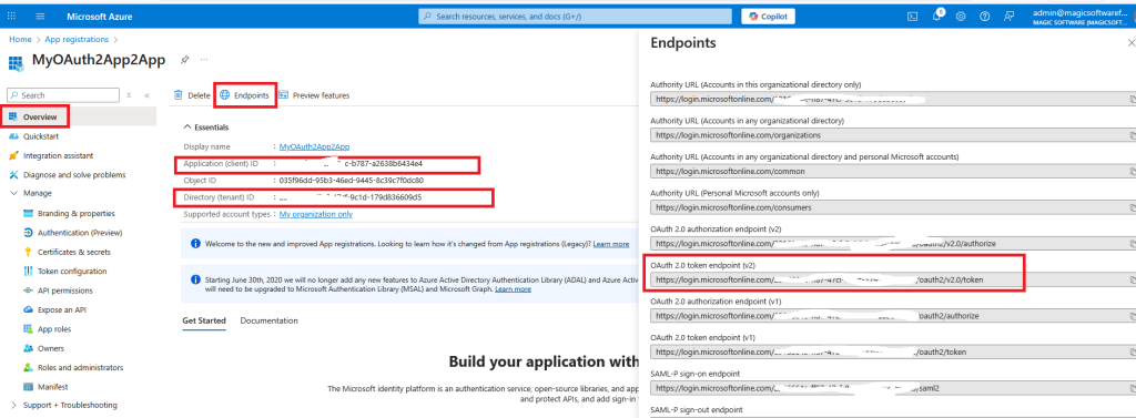 Click on Overview =>Endpoints and copy the token v2 URL, your client id and tenant id