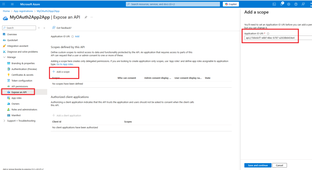 Click on Expose an API and add a scope, keep the value and Click Save and continue