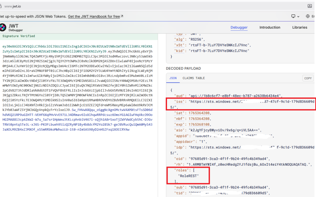 3/ Check in the token that you get « RoleREST » (roles) and the issuer (iss)