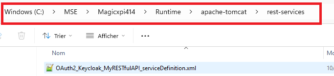7/ Copy the war file (xpiREST.war) from your installation directory (ex: <Magicxpi installation directory>\Runtime\addon_connectors\RESTfulAPI\servicefiles to your webapps apache directory (ex: <Magicxpi installation directory>\Runtime\apache-tomcat\webapps)