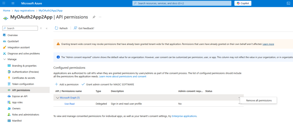 Click on API Permissions and remove Microsoft Graph (User.Read)