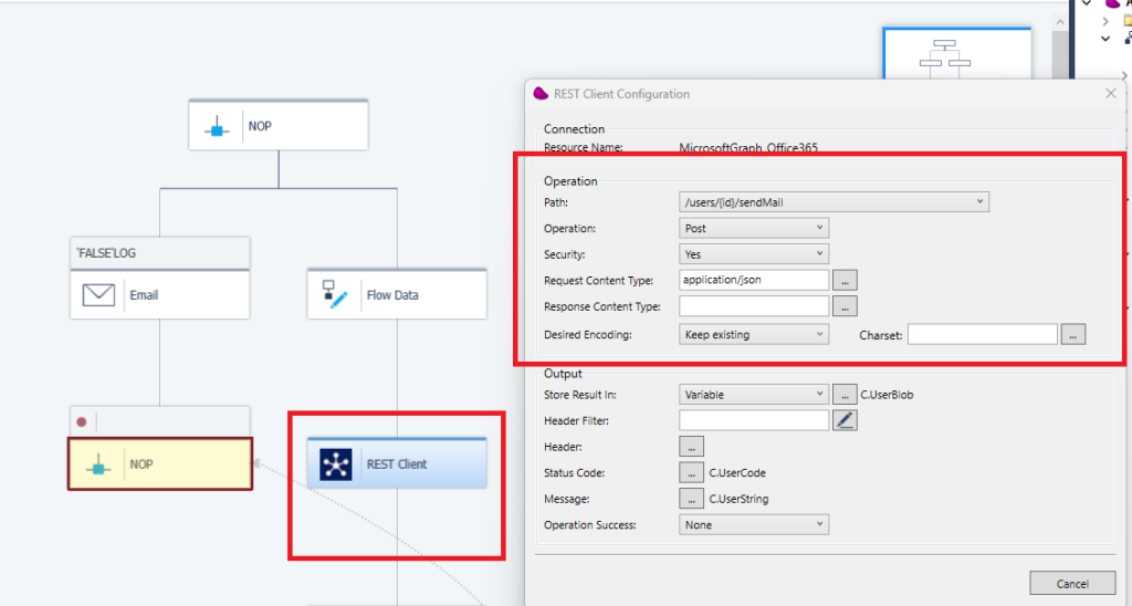 4/ Drag and Drop a REST Client connector and use /users/{id}/mailfolders/inbox/messages endpoint