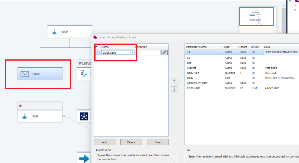 Drag and Drop the Mail connector and use the Quick Send method. The result should be the same.