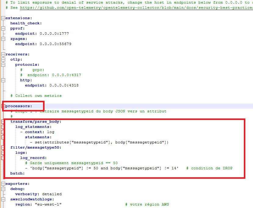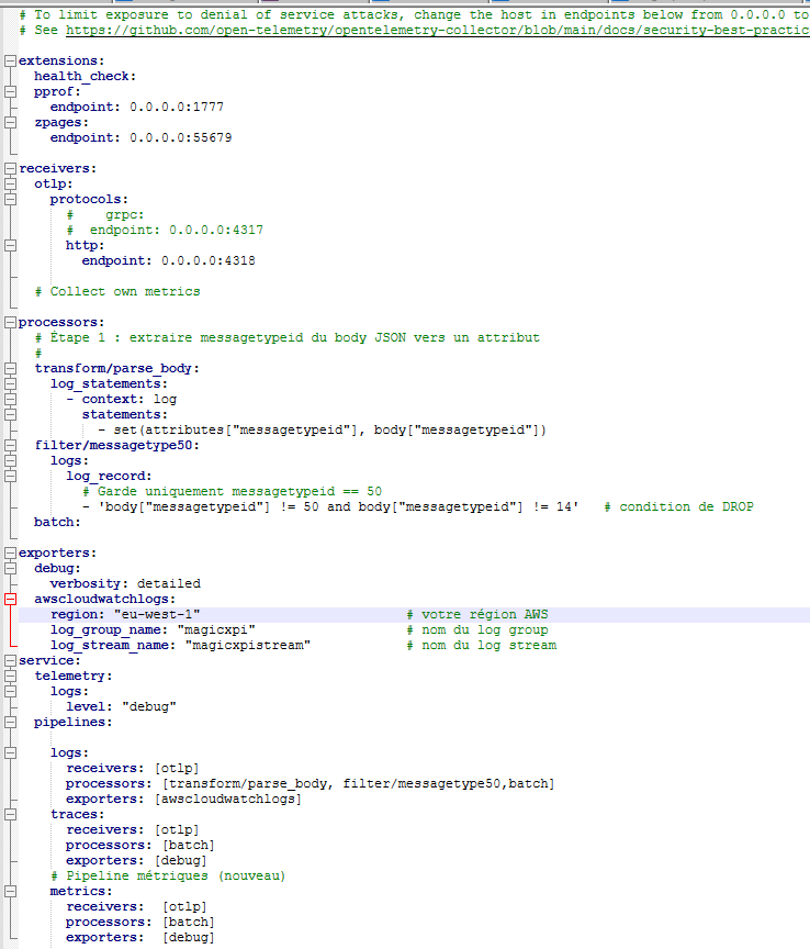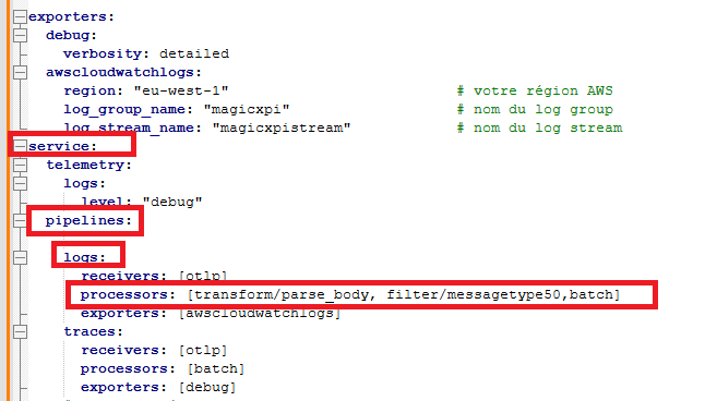 4/ (* optionnal) if you want to export only the Magic xpi BAM (messagetypeid=50) and Magic xpi Messages (messagetypeid=14), you have to fill the processors section in the yaml config file like below.