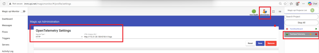 7/ Start the Magic xpi project et set the OTEL URL endpoint in the monitor.