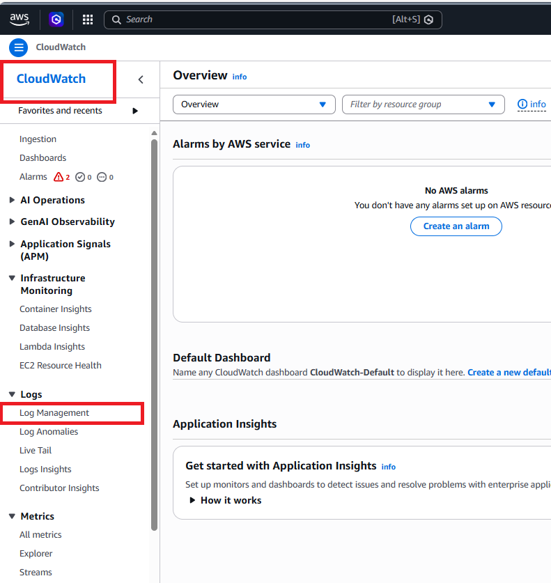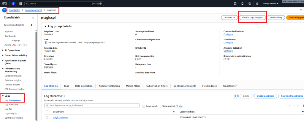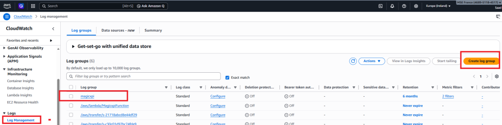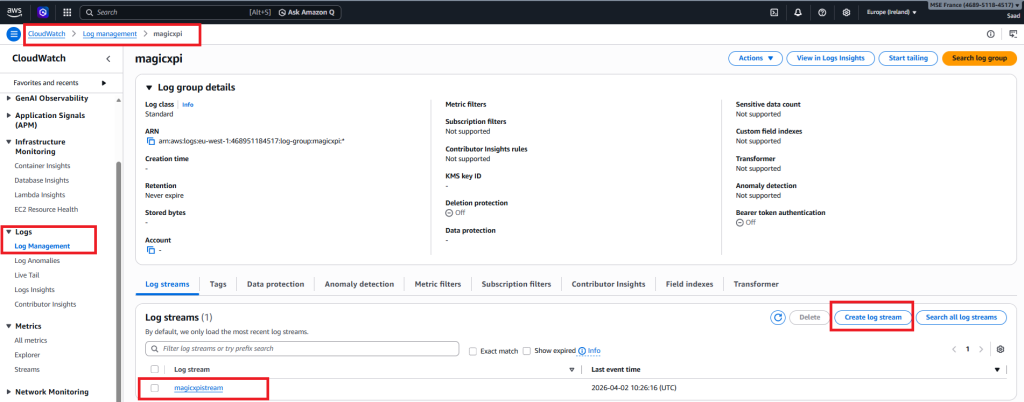 2/ Create a log group (magicxpi) and a log stream(magicxpistream)