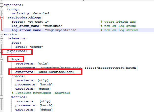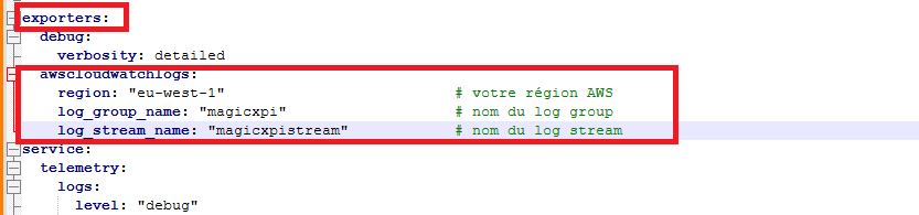 In the exporters section, you have to add the awscloudwatchlogs section with the relevant information.